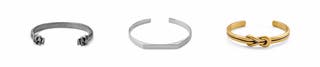 Bangle armbanden zijn solide, cirkelvormige stukken die ofwel een scharnier en slot hebben of over de hand glijden. Ze voegen een eenvoudige maar gedurfde touch toe aan je outfit, vaak alleen gedragen of gestapeld met andere armbanden voor een moderne, gelaagde look.