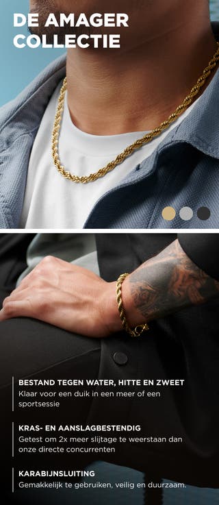 De touwketting vangt het licht langs de contouren, wat zorgt voor een subtiele, gelijkmatige glans in plaats van felle schittering. Door het gemiddelde visuele gewicht staat hij goed op zichzelf of juist in laagjes met fijnere kettingen voor extra structuur. De goudkleur combineert makkelijk met zowel casual als nette hemden en geeft een verzorgde, samenhangende look.