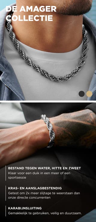 Los gedragen toont de touwstructuur een subtiele, mannelijke uitstraling. Als je hem combineert met andere kettingen, geeft hij meer gewicht en contrast aan een samengestelde look. Het zwarte roestvrij staal past goed bij casual overhemden of een eenvoudig T-shirt en voegt een stoere toets toe aan dagelijkse outfits. De afwerking en schakelstijl houden het silhouet strak en makkelijk te combineren met andere sieraden.