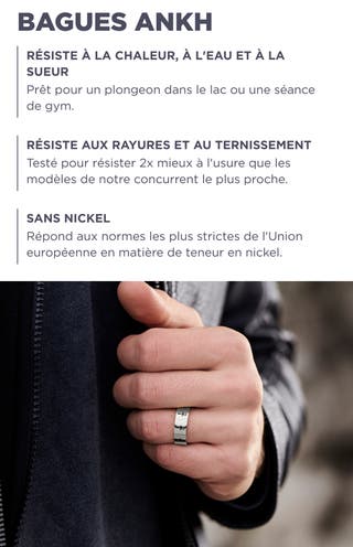 Portée bas sur le doigt, la face chevalière attire discrètement le regard, que vous portiez une tenue décontractée ou plus soignée. La combinaison noir et argent fait ressortir l'Ankh sans alourdir la bague. Elle se porte bien empilée avec d'autres bagues ou seule comme pièce singulière.