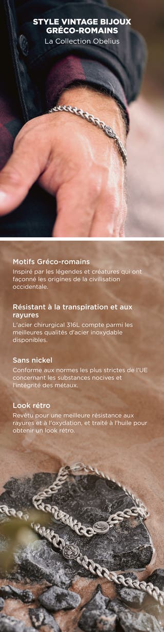 Ce bracelet est en acier inoxydable 316L et présente une chaîne gourmette à finition acier argenté. Les maillons sont formés et assemblés avec soin pour garder une silhouette discrète. Un petit médaillon rond, gravé subtilement, ajoute un détail discret. L'ensemble offre un rendu épuré et moderne avec une légère touche industrielle.