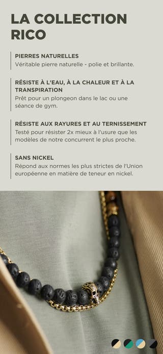 Set de colliers Rico en pierre de lave et œil de tigre vertSet de colliers Rico pierres de lave et œil de tigre vertSet de colliers Rico jaspe impérial et turquoise blanche Set de colliers Rico pierre de lave et obsidienne flocon de neige
