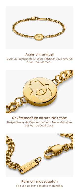 Ce bracelet est en acier inoxydable 316L avec une finition ton or et un disque Hamsa centré pour un détail discret. La chaîne fine et le médaillon aux bords lisses donnent une silhouette soignée et discrète. Le design reste moderne et épuré sans être trop décoré.