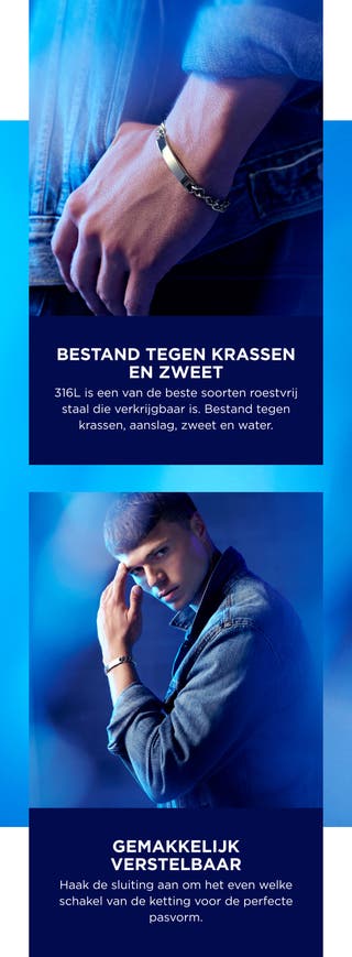 De platte ID-plaat en de dicht op elkaar zittende ketting vormen een evenwichtig silhouet dat goed staat los gedragen of samen met een horloge. De gepolijste zilverkleur is neutraal en combineert makkelijk met zowel casual als nettere outfits. De verstelbare lengte geeft je de keuze tussen een strakke of licht ontspannen pasvorm.