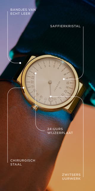 Dit horloge heeft een goudkleurige kast van 316L roestvrijstaal, een bijpassende gouden wijzerplaat en een zwarte leren band. De 24-uurs wijzerplaat met één wijzer zit onder dubbelbol saffierglas, voor een helder beeld met weinig reflectie. Het is een minimalistisch dresshorloge met duurzame materialen en een gepolijste afwerking.