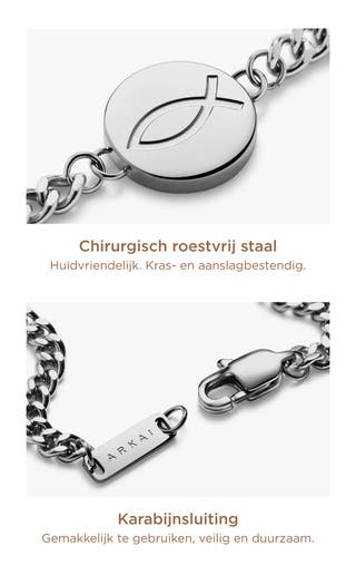 Deze armband is van 316L roestvrij staal met een gepolijste zilverkleurige afwerking voor een strakke, moderne uitstraling. De curb-schakelketting en het platte ovale medaillon zijn nauwkeurig gefreesd en hebben een subtiel gegraveerd vismotief. Door de slanke, ingetogen vorm blijft de armband sober en makkelijk te combineren.